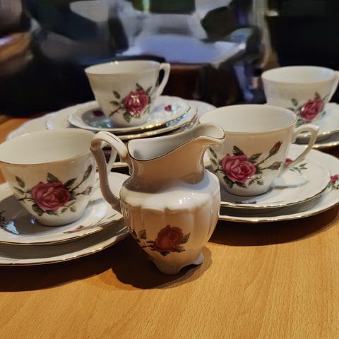 Kahviastiasto posliinia, punasävyisellä ja kultaisella koristekuviolla. Settiin kuuluu 11 kpl pieniä kahvikuppeja( 1,2 dl )lautasineen, 11 kpl matalia pullalautasia sekä saman sarjan pieni lyhty ja maljakko.