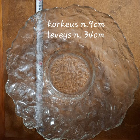 Lasinen neliönmuotoinen tarjoiluvati. Vadin koko noin 23 x 23 cm, korkeus n. 6,5 cm. Kirkas lasi, jossa kohokuvioitu narukuvioinen koristepinta. Esim. tarjoiluun, kattaukseen tai koristekäyttöön. Vadin reunat ovat loivasti kaartuvat ja kulmat pyöristetyt.