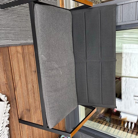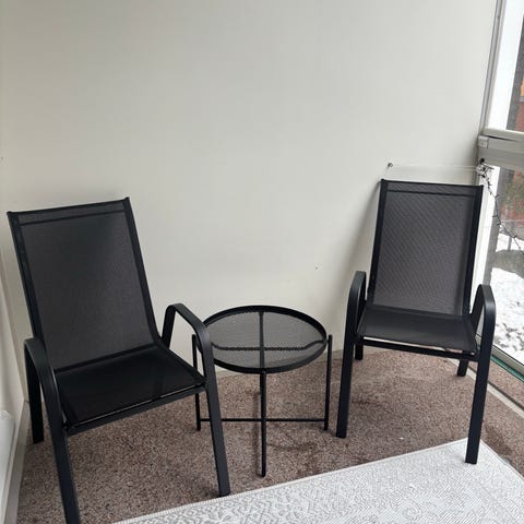2kpl/25e. Myyn yhdessä. Kaksi harmaata parveketuolia metallirungolla. Tuoleissa on kaarevat käsinojat ja kangasmainen istuin- ja selkänojaosa. Sopivat parvekkeelle tai terassille ulkokäyttöön. Runko on musta ja jalat ovat kevyesti taaksepäin kaartuvat, mikä helpottaa tuolien siirtelyä ja asettelua pienessäkin tilassa.