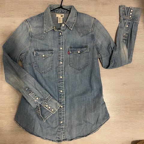 Levi's farkkupaita, sininen denim, naisten koko S. Paidassa on pitkät hihat, kaulus ja etutaskut.