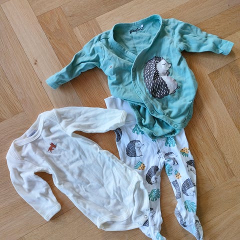 Hyvässä kunnossa olevat tuttan vihertävä potkuhaalari, Babyboomin valkoinen body ja valkoiset potkuhousut koossa 60