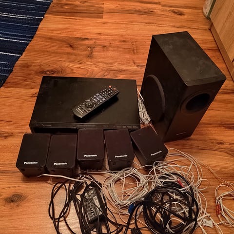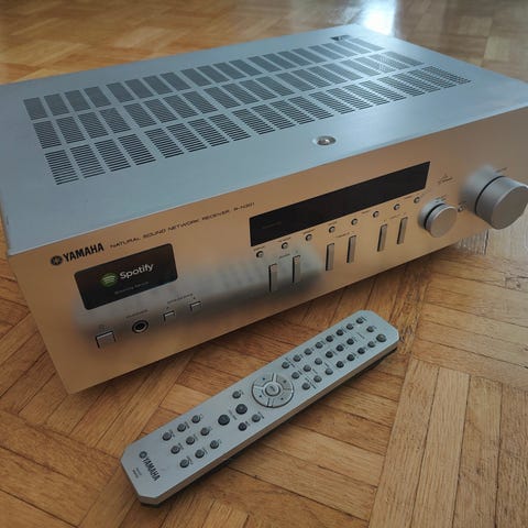Yamaha AV-viritinvahvistin hopeanvärisellä etupaneelilla. Laitteessa on useita analogisia ääni- ja video-liitäntöjä sekä kaiutinliitännät usealle kanavalle takapaneelissa. Etupaneelissa on äänenvoimakkuuden säädin, tulonvalitsimet ja muut perussäädöt. Mukana erillinen Yamaha-kaukosäädin, jossa on painikkeet eri tuloille ja toiminnoille. Soveltuu kotiteatteri- ja stereokäyttöön, kun liitetään yhteensopiviin kaiuttimiin ja äänilähteisiin.