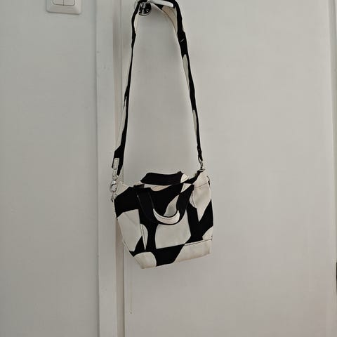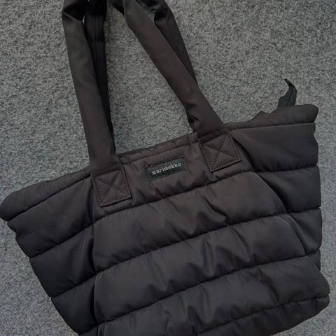 Marimekko laukku tummansinisellä pienet kivet kuviolla. Laukussa on pehmustettu rakenne ja kaksiosaiset kantokahvat. Päälokero suljetaan vetoketjulla, ja sisäpuolella on vetoketjutasku pientavaroille ja keskiosassa ns. läppäritasku vetoketjulla. Laukku on uudenveroinen, ehkä kerran käytetty.