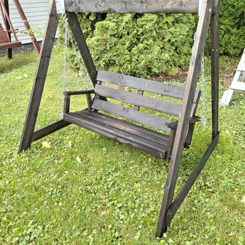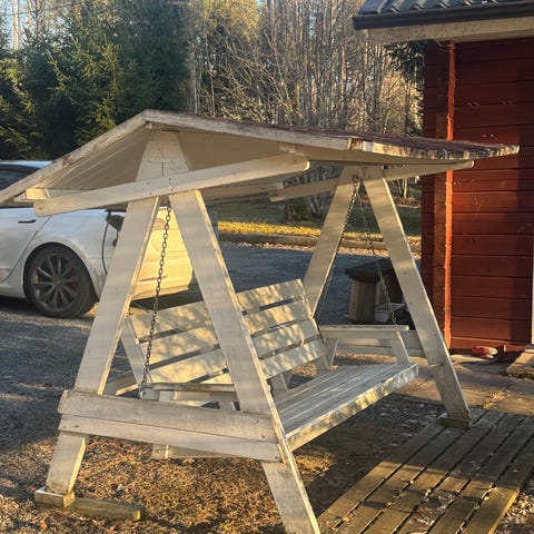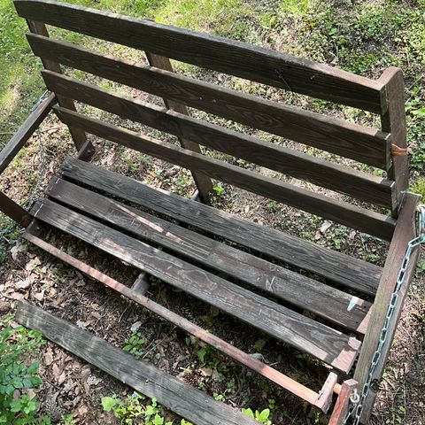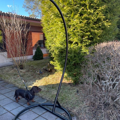 Metallirunkoinen puutarhakeinu, jossa on tumma kangasistuin. Sopii terassille tai puutarhaan ulkokäyttöön.
