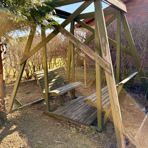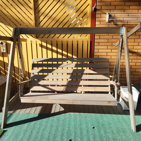 Puutarhakeinu vihreällä metallirungolla ja ruudullisilla istuinpehmusteilla