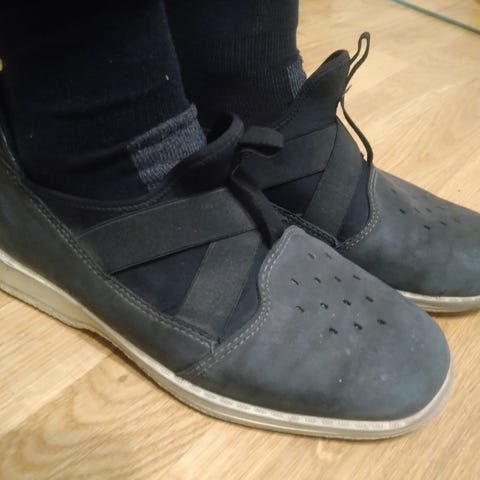 Promenan kengät kokoa 42. Etuosa jotain neopreenin tyylistä materiaalia, ja takaosa nahkaa. Pohjassa lukee anatomic safety sole. Kengissä olevasta suomenlipusta päätellen kotimainen merkki. Minusta varsin miellyttävät jalassa, mutta koko on mulle liian pieni.