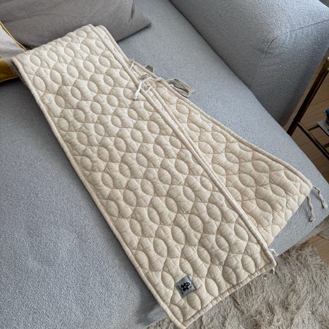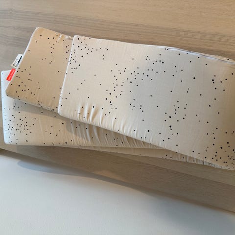 Pinnasängyn reunapehmuste luo mukavan ja turvallisen pesän vauvalle. Luomupuuvillainen kangas on miellyttävä ja pehmeä ja reunapehmuste on helppo kiinnittää narujen avulla. Reunapehmuste sopii standardikokoiseen 60 x 120 cm pinnasänkyyn.