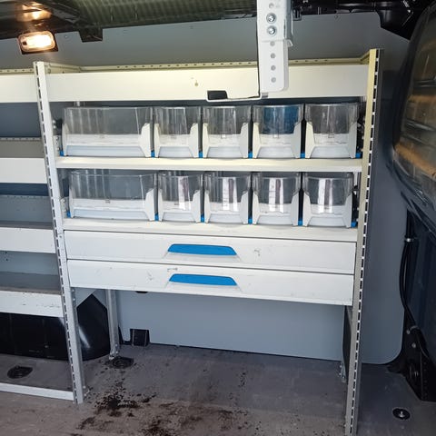 Pakettiauton hyllystö ja laatikostot metallia, väri harmaa. Kokonaisuus sisältää useita vetolaatikoita eri kokoisina sekä pienosalaatikoita ja avohyllyjä työkalujen ja tarvikkeiden säilytykseen. Soveltuu asennettavaksi pakettiauton kylkiseinälle tai muuhun ajoneuvoon, jossa tarvitaan järjestelmällistä säilytystilaa työvälineille ja tarvikkeille.