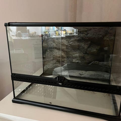 Mini ExoTerra terraario kahdella ovella ja lukituksella. Myös kannen saa kokonaan pois. Mukana kuvanmukainen 3D tausta.