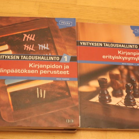 1) Yrityksen taloushallinto 1 – Kirjanpidon ja päätöksen perusteet. Kirja käsittelee yrityksen kirjanpidon ja taloudellisen päätöksenteon peruskäsitteitä ja -menetelmiä. Soveltuu liiketalouden ja taloushallinnon opintoihin sekä kirjanpidon perusteiden opiskeluun. Kirjanpainos vuosi on 2016. Pehmeä kantinen.