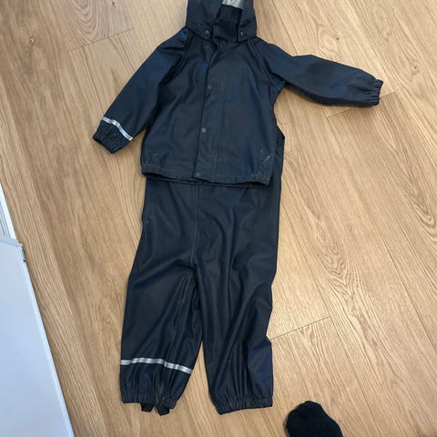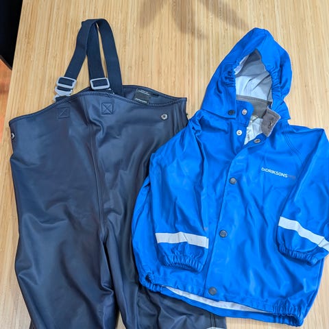 Väri punainen. Materiaali polyesteri. Unisex-malli, jossa säädettävät olkaimet ja lahkeissa kuminauhat. Housuissa on heijastinnauha lahkeessa parantamassa näkyvyyttä. Soveltuu käytettäväksi ulkoleikkeihin ja sateiseen säähän.
