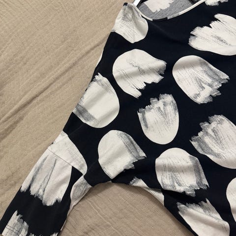 Kotimaisen valmistajan tunika/mekko 90% puuvillaa ja 10% elastaania. Kokomerkintä M, kai-kai 56cm, olka-helma 86cm. Kunto hyvä käytetty.