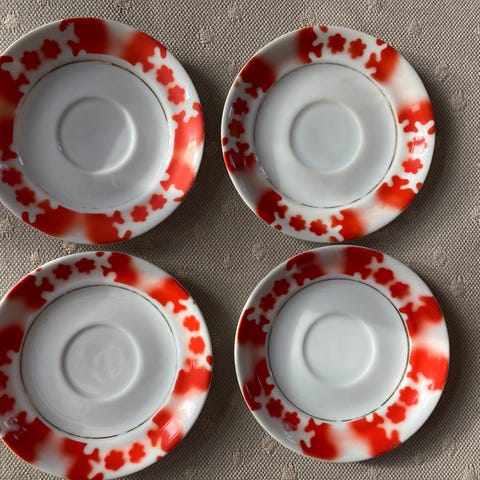 Kaksi kahvikuppia punaisella puhalluskuviolla. Kupeissa pieni puutos reunassa (1/kuppi, kuvat) Svea Granlund.yhteishinta 12€
