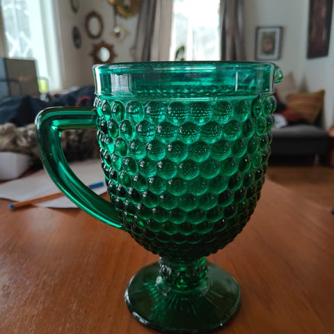 lasikannu meripihkanruskeaa lasia. Kannussa on kohokuvioitu pinta ja kaatoreuna sekä umpinainen lasikahva. Väri on läpikuultava meripihkanruskea. Ihanan tilava. Korkeus n. 23,5 cm, leveys alhaalta n. 12 cm
