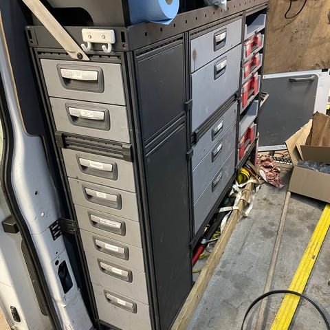 Pakettiauton hyllystö ja säilytysjärjestelmä metallia. Kokonaisuus sisältää useita pitkiä hyllyjä, vetolaatikoita sekä läpinäkyviä säilytyslaatikoita pienosille. Hyllyt ja laatikostot on kiinnitetty auton sivuseiniin ja lattiaan, ja järjestelmä soveltuu työkalujen, tarvikkeiden ja varaosien järjestelmälliseen säilytykseen pakettiauton tavaratilassa. Metallirakenne tarjoaa tukevan rungon, ja päätylevyissä on rei’itys lisävarusteiden ja koukkujen kiinnittämistä varten. Kokonaisuus on suunniteltu helpottamaan tavaroiden lajittelua ja nopeaa saatavuutta liikkuvassa työssä, kuten huolto- ja asennusajoneuvoissa.