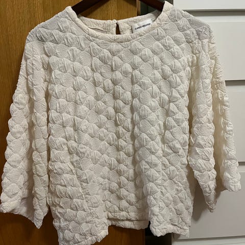 Valkoinen pitkähihainen pusero. Koko M, kainalo-kainalo 52 cm ja pituus 71 cm. Pesulappu leikattu.