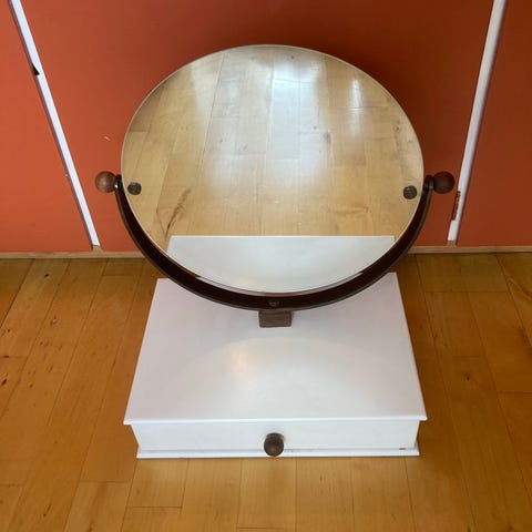 Vuosikymmenien takaa jo elämää nähnyt piianpeili laatikolla. Jos haluaa entisöidä, kaipaa maalia ja ruuvit kiristelyä