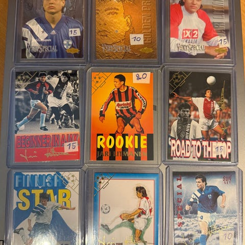 Jari Litmasen -keräilykorttikokoelma kansiossa. Näitä on tehty 5000 kpl ja tämä on numero 2964. 9 kpl kortteja, joissa on erilaisia teemoja kuninkaan uran huippuvaiheista (Reipas, MyPa, Ajax, Maajoukkue). Kortit ovat muovitaskuissa mustassa kansiossa. Sopii esimerkiksi kokoelmaksi jalkapallosta ja Jari Litmasen urasta kiinnostuneelle tai aiempaa kokoelmaa täydentämään.
