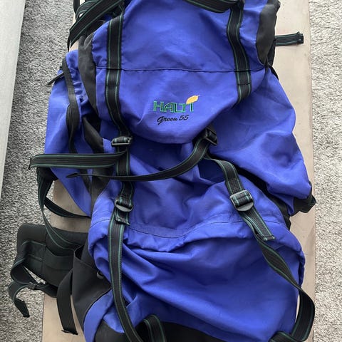 Halti vaellusrinkka. Väri musta punaisilla yksityiskohdilla. Rinkassa on säädettävät olka- ja rintahihnat sekä useita kiristysremmejä. Sadesuoja mukaan! Täysin ehjä ja hyvässä kunnossa.