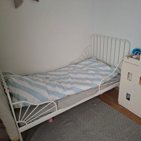 IKEA juniorisänky, väri valkoinen. Sopii lapselle siirtymävaiheen sängyksi pinnasängyn ja täysikokoisen sängyn väliin. Sängyssä on matala turvalaita toisella sivulla, joka auttaa estämään putoamista nukkuessa. Runkomateriaali on maalattua puuta. Sänky on suunniteltu käytettäväksi junioripatjan kanssa, joka ei sisälly tietoihin. Soveltuu lastenhuoneeseen yksittäiseksi nukkumapaikaksi.