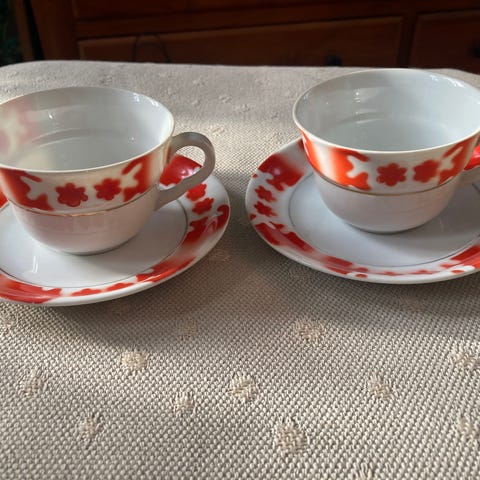Tassit punaisella puhalluskuviolla. Yhdessä pohjarenkaassa puutos (kuva). Svea Granlund