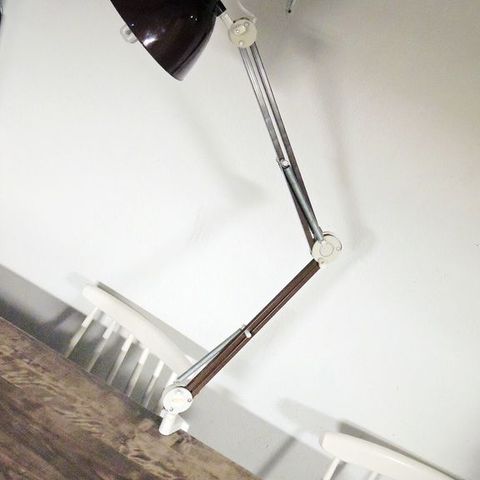Hyväkuntoinen ja toimiva 70-luvun työvalaisin. Varren pituus noin 100 cm. Metallinen kiinnitysjalka.
