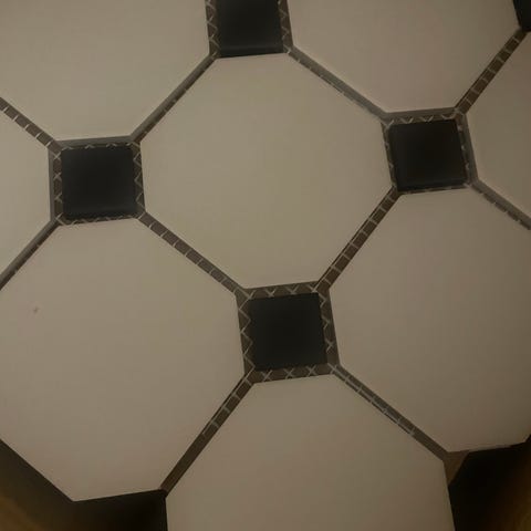 Kuvioidut lattia- tai seinälaatat mustavalkoisella ornamenttikuvioinnilla. Materiaalina on keramiikka. Laatat soveltuvat esimerkiksi kylpyhuoneen tai wc-tilan lattiaan ja seinään tai muihin sisätilojen laatoituskohteisiin. Kuviointi muodostaa toistuvan, klassistyylisen pinnan useamman laatan asennettuna.