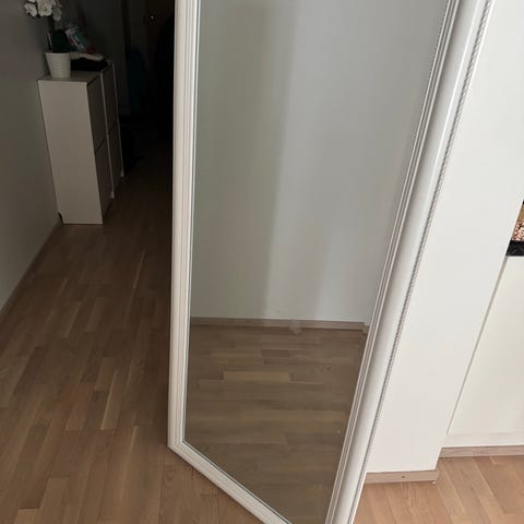 Jysk kokovartalopeili, jossa valkoinen, koristeellinen kehys. Peili on suorakaiteen muotoinen ja soveltuu esimerkiksi makuuhuoneeseen, eteiseen tai vaatehuoneeseen. Taustassa on kiinnikkeet seinälle ripustamista varten, mutta yksi kiinnike on rikki. Kehyksessä on koristeyksityiskohtia kulmissa ja reunoilla. Peili voidaan käyttää sekä pystyasennossa että nojaavana lattiaa vasten sisustuselementtinä ja pukeutumispeilinä. Jotain pieniä jälkiä löytyy sieltä täältä mutta yleisilme siisti! Ja peili on ehjä! 72x162