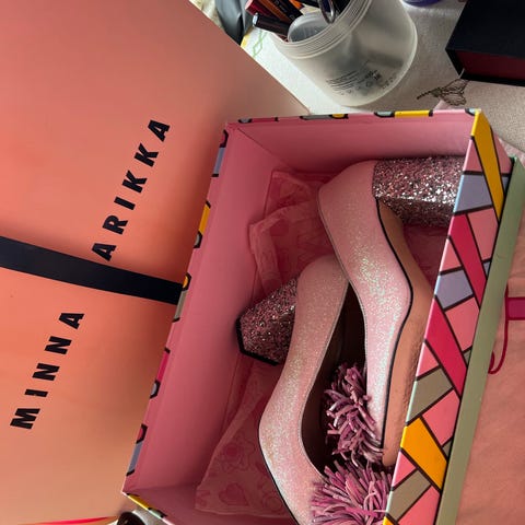 Minna Parikka korkokengät, koko 35. Pinkit glitter-pintaiset korkokengät, joissa on paksu, tukeva korko 7.5cm sisämitta 22cm. Postit 10.90