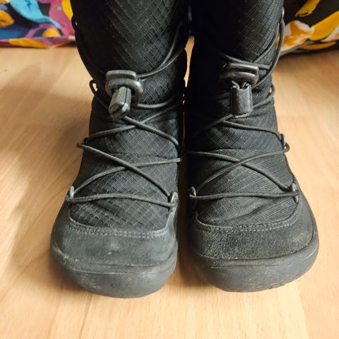 Erittäin käytetyt, mutta vielä on käyttökelpoiset. Olisi meillä menneet vielä, mutta jäivät pieniksi. Tarrat pysyvät kiinni, liimaukset lähteneet, mutta se ei haittaa sillä tikkaukset pitää hyvin edelleen.