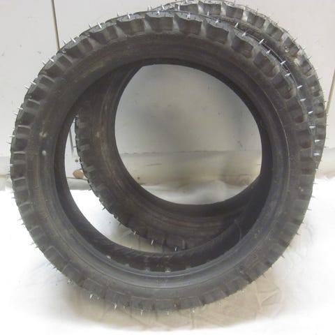 13 tuumaiset nastarenkaat jossa kulumapinta on uudehko mutta muutama nasta puuttuu. Itse en ole ajanut renkailla ollenkaan kun ei päässyt käyttöön. Renkaan koot ovat etu 130-60-13 Taka 140-60-13. Renkaat eivät vuoda.