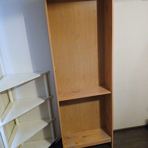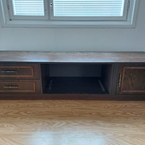 Annetaan vankkatekoinen pitkä taso, jossa 2 vetolaatikkoa ja säädettävät hyllyt molemmilla puolilla. Kestävä ja vankkatekoinen; kestää jopa istumista. Ollut lastenhuoneen leikkitasona ja nyt eteissä säilytyskalusteena. Maalipinnassa on jonkin verran vaurioita (ks. kuvat). Leveys 174cm, syvyys 40.5cm, korkeus 39.5cm.