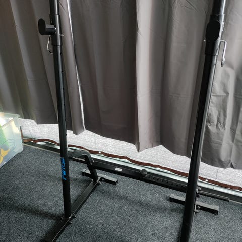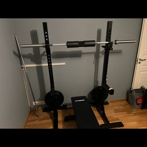 Ylimääräisenä kuvan mukainen teline, ei penkkiä. Teline sopii myös penkkipunnerrukseen jos on sopiva penkki. Laitteessa on käytön jälkiä mutta tukeva ja täysin toimiva. Varmistus rautojen toinen tappi on vääntynyt ja toisesta muovi rikki. Kromatussa tukiraudassa on jälkiä. Kuitenkin täysin toimiva. Kulkeutuu mukana hml-helsinki ja siihen välille.