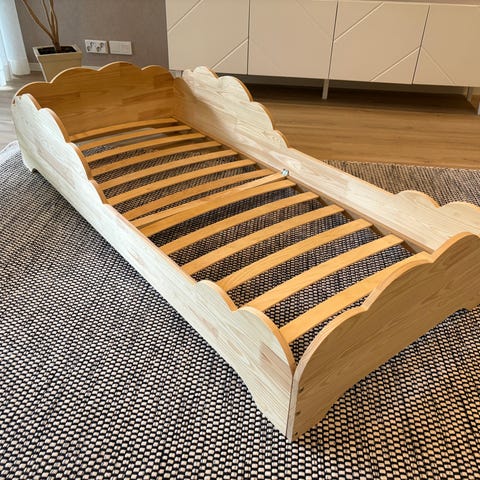 Myydään lasten jatkettava sänky, patja (120 cm pitkä ja 78 cm leveä), kaksi jatkopalaa (toinen 30 cm pitkä ja toinen 30 cm, molemmat 78 cm leveitä) sekä petauspatja (120 cm pitkä) yhteishintaan 30 euroa. Pisimmillään sänky on n. 185 cm. Käytön jälkiä on jonkun verran päädyissä (ks. kuvat 3 ja 4), mutta muuten hyvässä kunnossa ja ehjä. Sängyssä on kaksi erillistä osaa, jotka saadaan irti toisistaan.