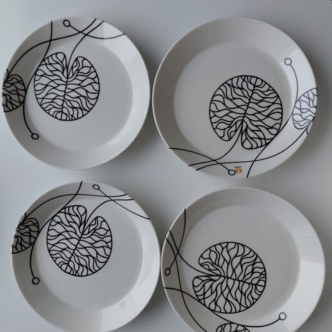 4 matalaa lautasta. Lautasen läpimitta 26cm. Yhdessä lautasessa pieni särö ulkoreunalla, ei haittaa käyttöä. Koko satsi 95e. Lähetys ostajan vastuulla, tosin pakkaan hyvin.