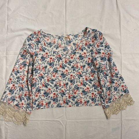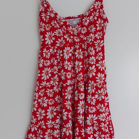 Kaunis kukkakuosi vaalealla pohjalla. Malli on lyhyt ja siinä on röyhelöyksityiskohtia helmassa ja hihoissa. Vyötäröllä kuminauha.