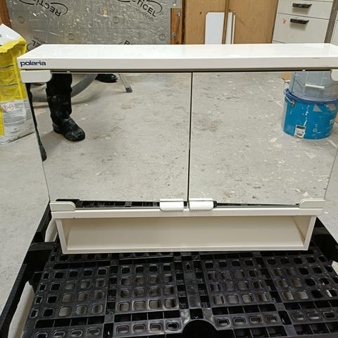 Siisti valkoinen peltinen peilikaappi Polaria. Kaksipuoleiset peilit. Leveys 55 cm, korkeus 55 cm, syvyys 14 cm. Perusmalli, ei valoa tai pistorasiaa. Käteismaksu.