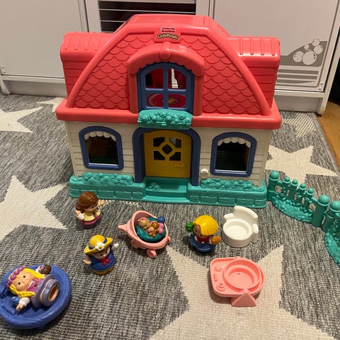 Fisher-Price Little People leikkilinna. Kuvassa näkyvät muurit, hahmot ja hevonen mukaan. Lippua painettaessa lastaussilta aukeaa, valot vilkkuvat ja kuuluu musiikkia, toimii.