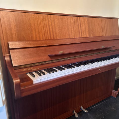 Etude pystypiano ruskealla, kiiltäväpintaisella puuviilukotelolla. Soittimessa on täysikokoinen koskettimisto ja kaksi poljinta. Pianotuoli mukaan.