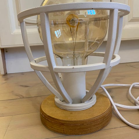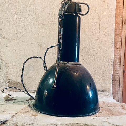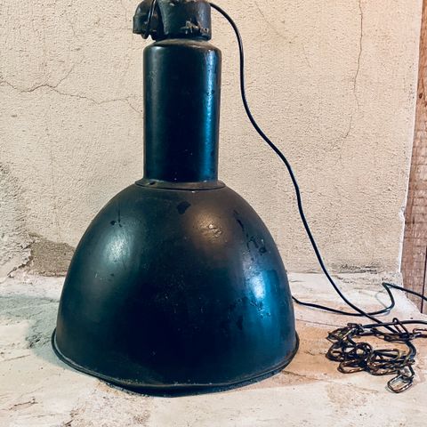 Vanha industrial-henkinen metallinen pöytävalaisin. Vaatii kunnostusta (mm. valokatkaisin rikki).