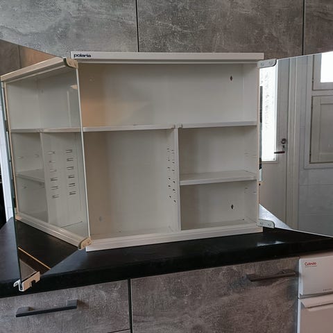 Siisti valkoinen peltinen peilikaappi Polaria. Kaksipuoleiset peilit. Leveys 60 cm, korkeus 46 cm, syvyys 14 cm. Perusmalli, ei valoa tai pistorasiaa. Käteismaksu.