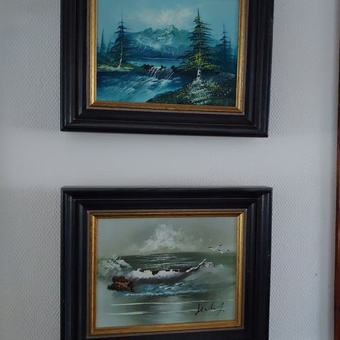 Kapea meriaiheinen taulu, jossa sinisävyinen aaltoileva pinta. Teos on pystysuuntainen ja kehystetty koristeellisilla kultavärisillä kehyksillä. Sopii esimerkiksi seinäkoristeeksi olohuoneeseen, käytävään tai muuhun sisätilaan. 96x37 cm. Nimi " Tyrskyjä"