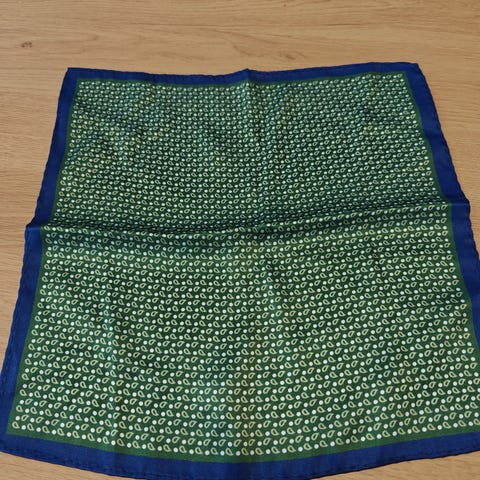 Vaaleansininen taskuliina valkoisilla palloilla. Lapun mukana 100 % silkkiä.