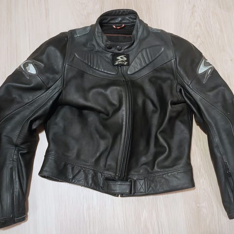 Spyke ajotakki, koko 48. Värit musta, punainen ja valkoinen. Takissa korkea kaulus ja etuvetoketju, edessä ja takana suuret logot. Hihansuissa ja hihoissa säätöremmit istuvuuden säätämiseen. Sopii moottoripyöräilyyn tai muuhun ajokäyttöön. Materiaali vaikuttaa olevan tekstiiliä; tarkka materiaalikoostumus ei käy ilmi.