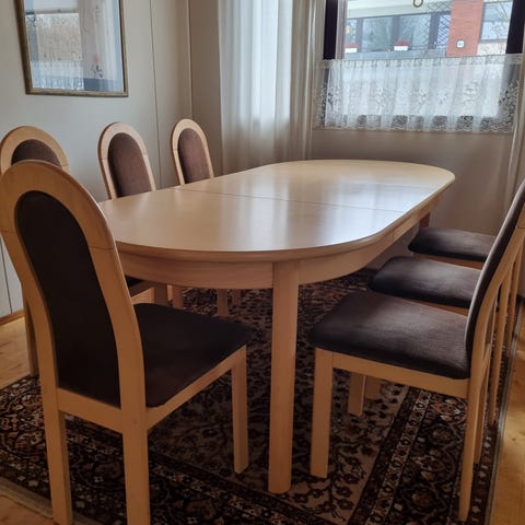 Todella tukeva jatkettava pöytä. Mainio kotiin tälläisenään 160cm mittaisena. Yhdessä tuolissa oli piilevä valmistusvika ja jalka katkesi. Nyt on siis 5 ehjää tuolia ja yksi "korjattavissa" oleva mukaan. Pöydässä ja tuoleissa on pientä kulumaa ja käytönjälkeä kyllä. Tämä on kovaa täyspuuta ja hiottavissa esim. pöydän kannen osalta helposti uuden veroiseksi halutessa.