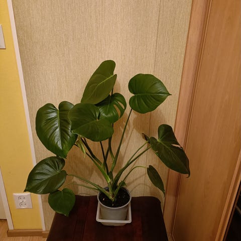 Monstera deliciosa -huonekasvi kookoskuitutukikepillä. Kasvi on istutettu suureen valkoiseen muoviruukkuun, jossa on multatila ja erillinen kastelumittari. Lehdet ovat vihreät ja liuskoittuneet, osassa lehtiä on ruskeita kärkiä. Sopii sisätiloihin valoisaan, mutta ei suoraan paahteiseen paikkaan. Kasvi tarvitsee säännöllistä kastelua ja ajoittaista lannoitusta kasvukaudella.