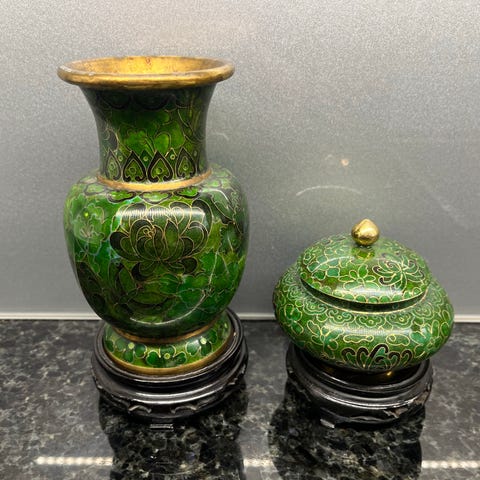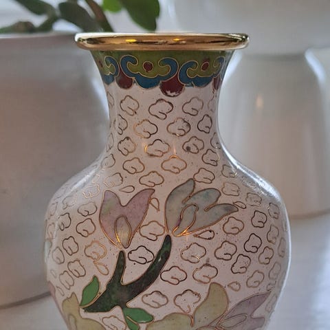 Cloissonne maljakko 10 cm. Emalointimenetelmällä tehty. Ostettu Kiinasta matkamuistoksi. Maljakon pinta hienossa kunnossa, maljakon sisäosasss tummentumaa johtuen käytöstä. Löytyy myös vaalea maljakko omalla ilmoituksella. Savuton ja kotieläimetön talous.