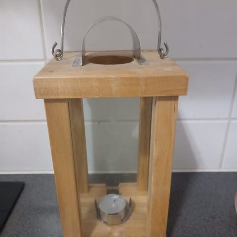 Jysk lyhty, jossa puu runko lasipaneeleilla ja koristeellisesti kuvioitu metallinen kupu. Lyhdyssä on avattava ovi ja yläosassa ripustusrengas. Sopii esimerkiksi sisäkäyttöön tunnelmavalaisuun tai koristeeksi.