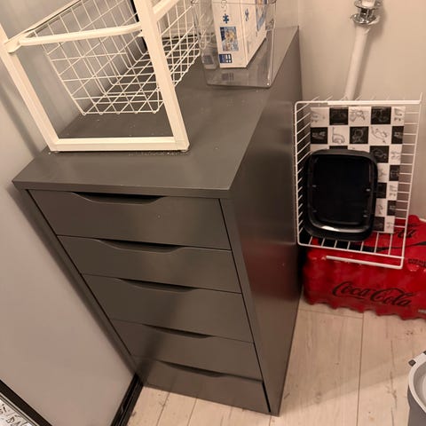 Annetaan IKEA Kallax-hylly. Toiselta sivulta puuttuu kiinnitystulpat, katso kuva.