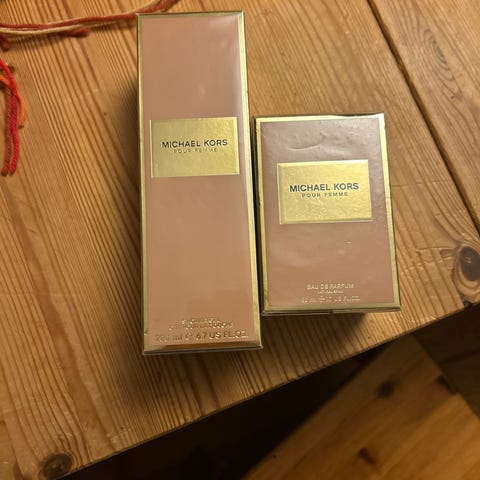 Michael Kors hajuvesi ja suihkugeeliTuote on pakattu vaaleanpunaiseen ja kultareunaiseen laatikkoon. Sopii käytettäväksi päivittäisenä tuoksuna tai juhlatilaisuuksissa. Pakkauksessa näkyy viivakoodi ja QR-koodi pohjassa. Tarkemmat tiedot, kuten tuoksunuotit ja tilavuus, löytyvät pakkauksen kyljestä.